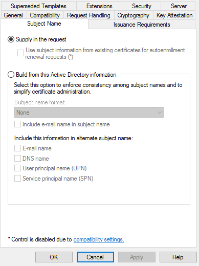 7. In the Subject Name tab, enable the Supply in the request radio button.