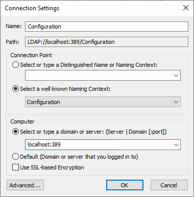 Under Connection Point, click Select a well known Naming Context, and then select Configuration.