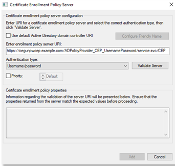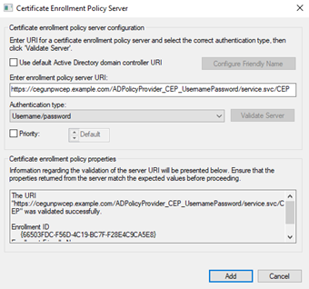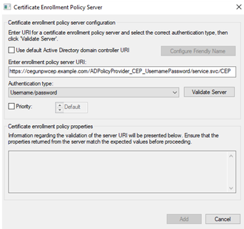 - Click Add. The Certificate Enrollment Policy Server dialog box appears.