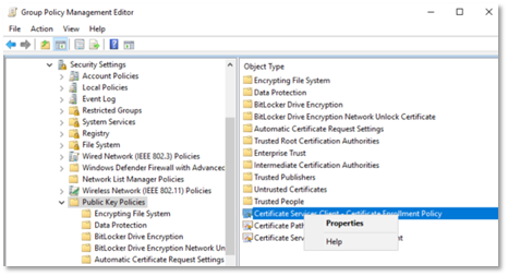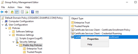 - In the content pane, right-click Certificate Services Client - Certificate Enrollment Policy > Properties.