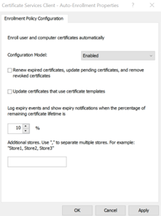 The Certificate Services Client Auto Enrollment Properties dialog box appears. - In the Configuration Model drop-down list, select Enabled.
