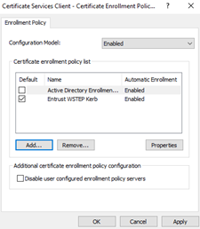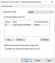 The Certificate Services Client - Certificate Enrollment Policy Properties dialog box appears. - In the Configuration Model drop-down list, select Enabled.