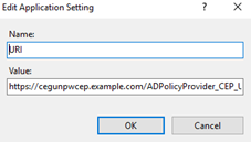 - If you configured user name and password authentication for the Certificate Enrollment Policy Web Service, the identifier is ADPolicyProvider_CEP_UsernamePassword.
