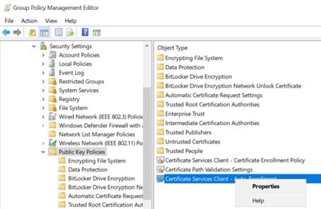 - In the content pane, right-click Certificate Services Client Auto Enrollment > Properties.