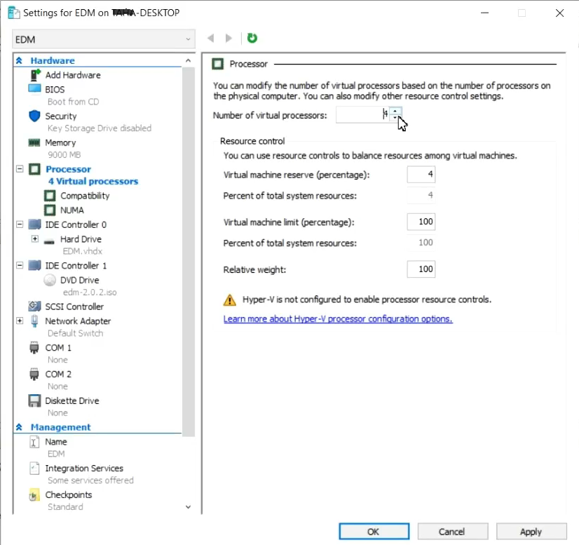 - In the Number of virtual processors field, select the cores stated in Machine requirements.