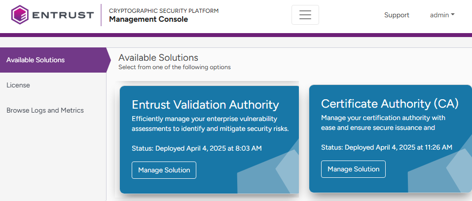 is the IP address or domain name of the machine hosting Cryptographic Security Platform.- Log into the Management Console a user belonging to a role with Validation Authority management permissions – for example, the initial