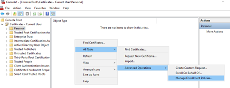 - Right-click Personal > All Tasks > Advanced Operations > Manage Enrollment Policies.