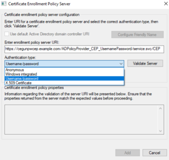 The Certificate Enrollment Policy Server dialog box appears. - In the Enter enrollment policy server URI field, enter the URL of the Certificate Enrollment Policy Web Service that you obtained earlier in Configuring Windows Domain Endpoints.