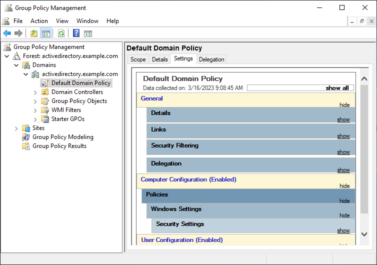 The Group Policy Management dialog box appears. - In the tree view, select Group Policy Management > Forest: <forest> > Domains > <domain> > Default Domain Policy.