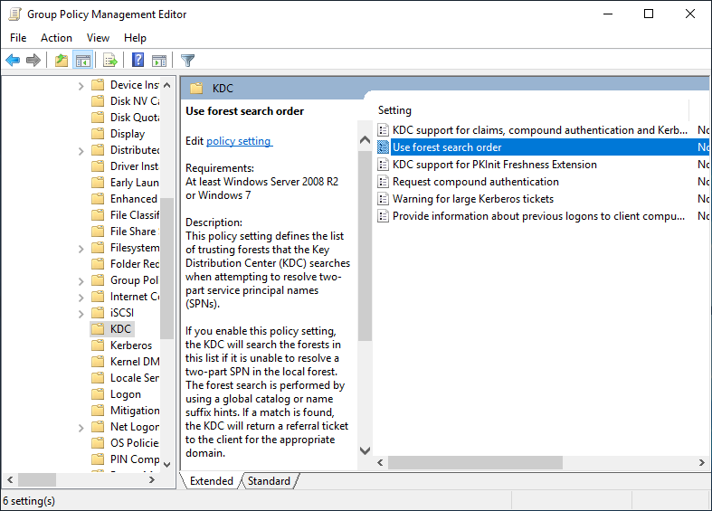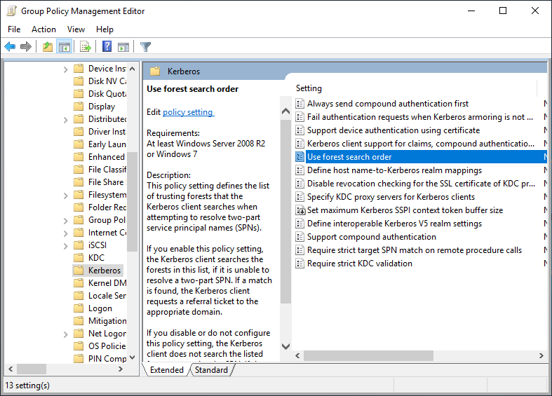 For cross-forest deployments, both the Key Distribution Center (KDC) and the Kerberos client must search a list of trusted forests when attempting to resolve a two-part SPN if the SPN cannot be found in the local forest. The list of trusted forests that the KDC and Kerberos clients can search is controlled by Group Policy settings in the domain controller. Cross-forest WSTEP enrollment can fail if the KDC or Kerberos client cannot resolve the two-part SPN. The list of trusted forests must be the same for both the KDC and Kerberos clients.