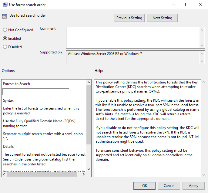 In the Options pane, in the Forests to Search field, enter the list of trusted forests that the Key Distribution Center (KDC) will search when attempting to resolve a two-part SPN that does not exist in the local forest. Separate each forest with a semicolon. For example: