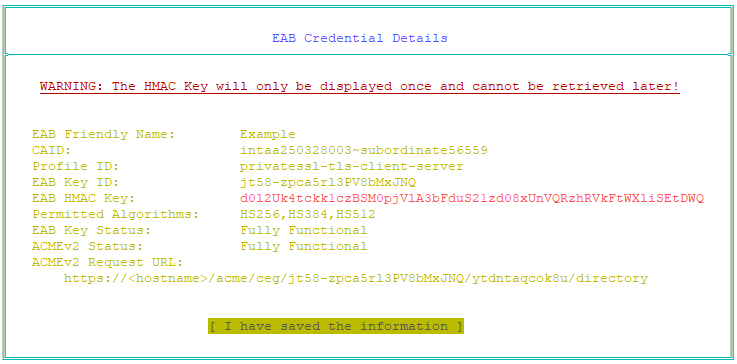 The External Account Binding credential is created. The EAB Credential Details page appears. For example:The HMAC key will be displayed only on this page, and cannot be retrieved later. You must copy this HMAC key before closing the page.