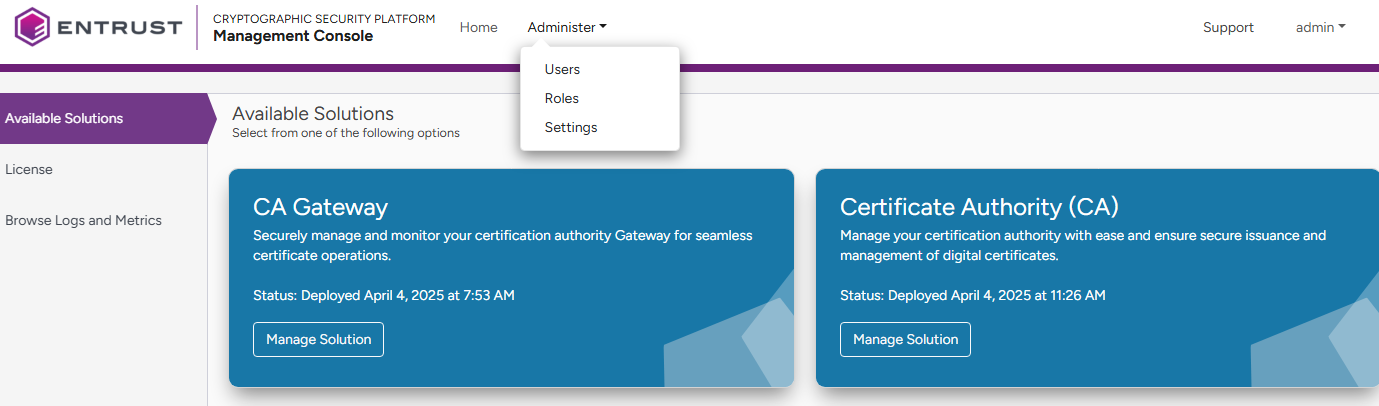 is the IP address or domain name of the machine hosting Cryptographic Security Platform.- Log into the Management Console as a user belonging to a role with user management permissions – for example, the initial