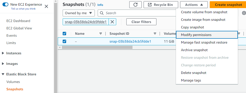 - Select Elastic Block Store > Snapshots in the navigation sidebar.