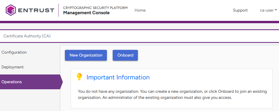 is the IP address or domain name of the machine hosting Cryptographic Security Platform.- Log in to the Management Console as one of the users created in Creating Certificate Authority tenants. This user will be the tenant of the new organization and the Certificate Authorities it contains.