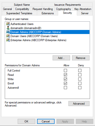Click this tab and assign the following permissions to the group to which RA recovery agents will belong (for example, the Domain Admins user group).