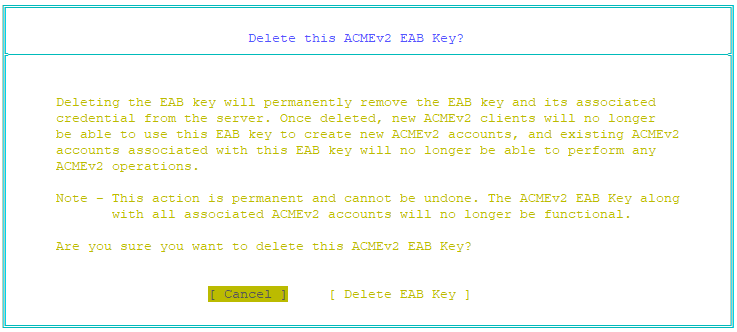The Delete this ACMEv2 EAB Key page appears. - Select Delete EAB Key and press Enter.
