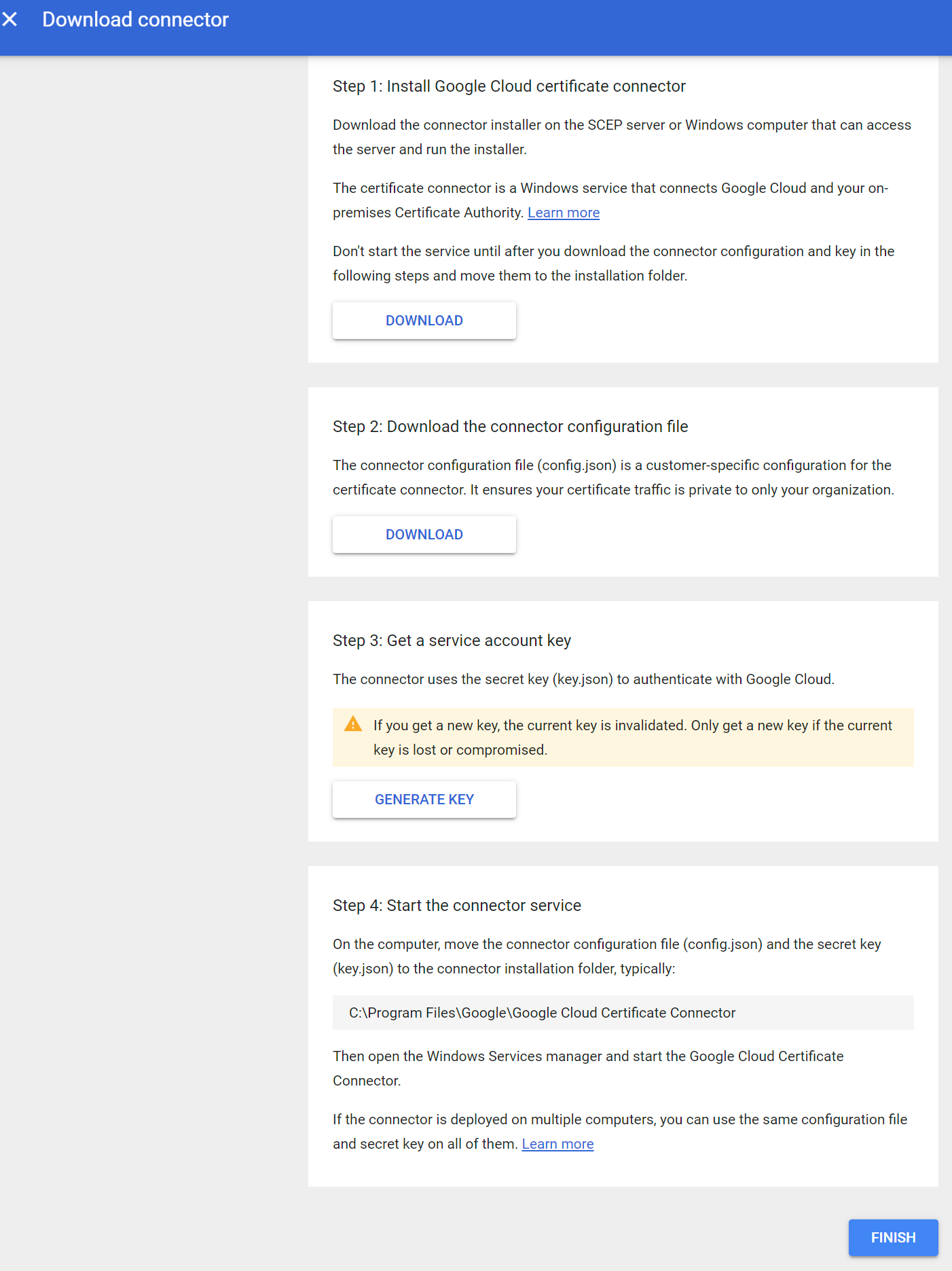 ) for Google Cloud Certificate Connector. - In the Step 3 pane, click GENERATE KEY to generate and download a key file (