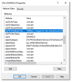 - Under Attributes, select msPKI-Enrollment-Servers. The URL in this field is preceded by three integers, where: