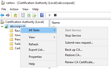 - Select All Tasks > Stop service to stop the Microsoft CA server.