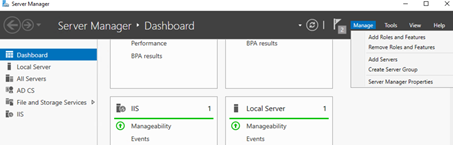 The Server Manager dialog box appears. - Select Manage > Add Roles and Features.