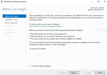 The Add Roles and Features Wizard dialog box appears. - If the Before you Begin page appears, click Next.