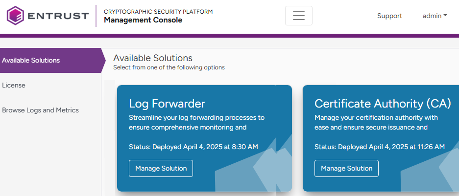 - In the content pane, click Manage Solution under Entrust Log Forwarder.
