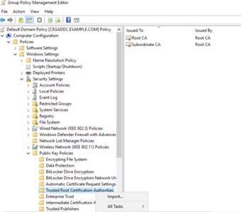 The Group Policy Management Editor dialog box appears. - In the tree view, expand Computer Configuration > Policies > Windows Settings > Security Settings > Public Key Policies > Trusted Root Certification Authorities.