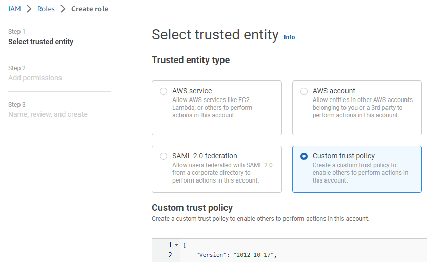 - In the Add permissions page, select the policy described in Configuring the IAM policy.