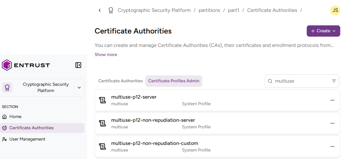 - Click Certificate Authorities in the sidebar and select the Certificate Profiles Admin tab.