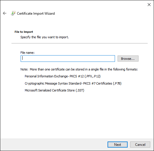 The Certificate Import Wizard dialog box appears. - Click Next.