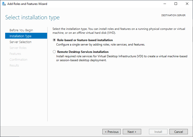 5. Click Role-based or feature-based installation. By default, this option is already selected.