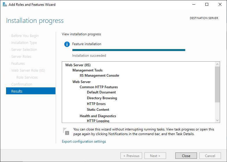 18. The Installation Progress page appears. A progress indicator displays the progress of the installation. After IIS is installed, the Installation results page appears.