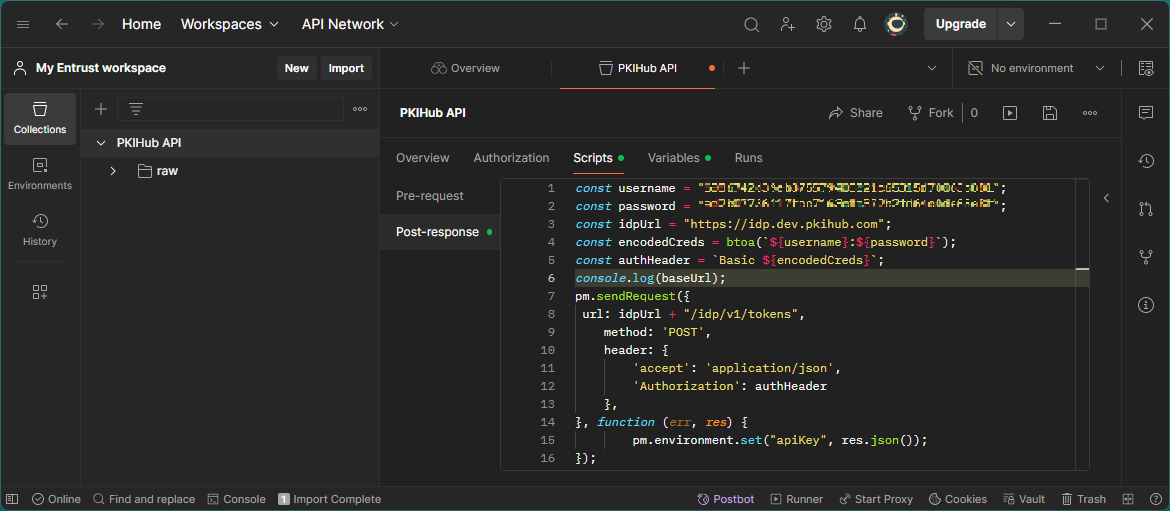 const username = "<subjectId>";const password = "<password>";const idpUrl = "<idpUrl>";const baseUrl = pm.variables.get('baseUrl');const encodedCreds = btoa(`${username}:${password}`);const authHeader = `Basic ${encodedCreds}`;console.log(baseUrl);pm.sendRequest({ url: idpUrl + "/idp/v1/tokens", method: 'POST', header: { 'accept': 'application/json', 'Authorization': authHeader },}, function (err, res) { pm.environment.set("apiKey", res.json());});Where each placeholder corresponds to the following value.