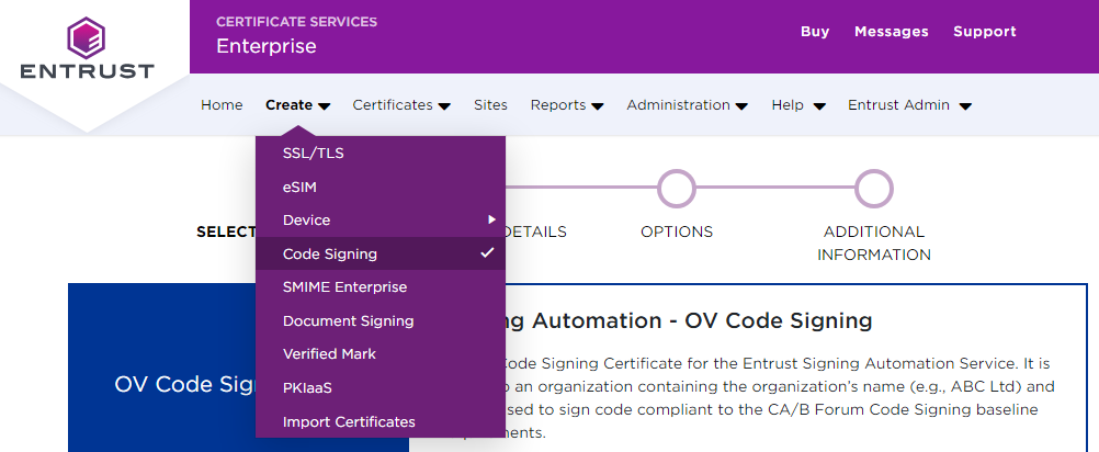 In the sidebar menu, click Signing Automation - OV Code Signing .