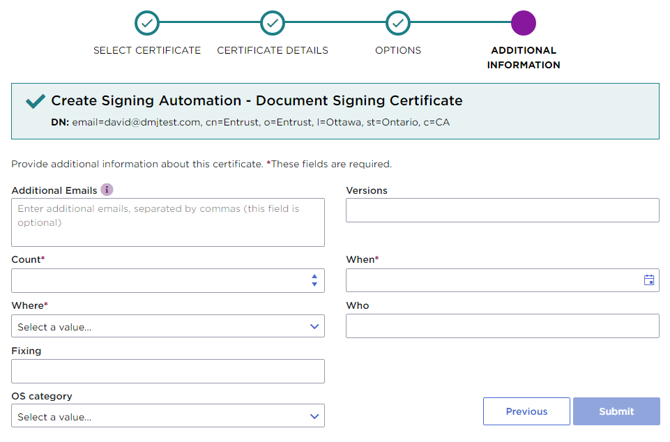 The email address of the certificate owner. Entrust will use the selected email address to send notifications on the certificate status. | ||