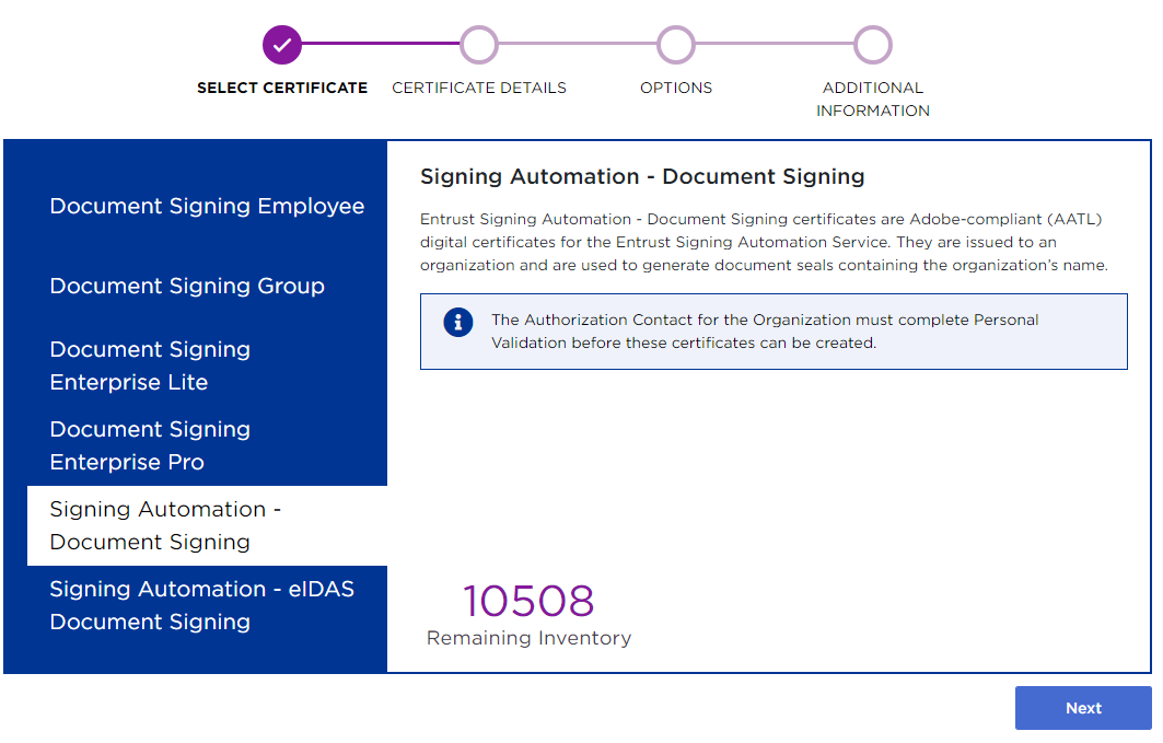 In the Remaining Inventory section of this page, check the number of certificates you can create. Click Next if you still have remaining certificates.