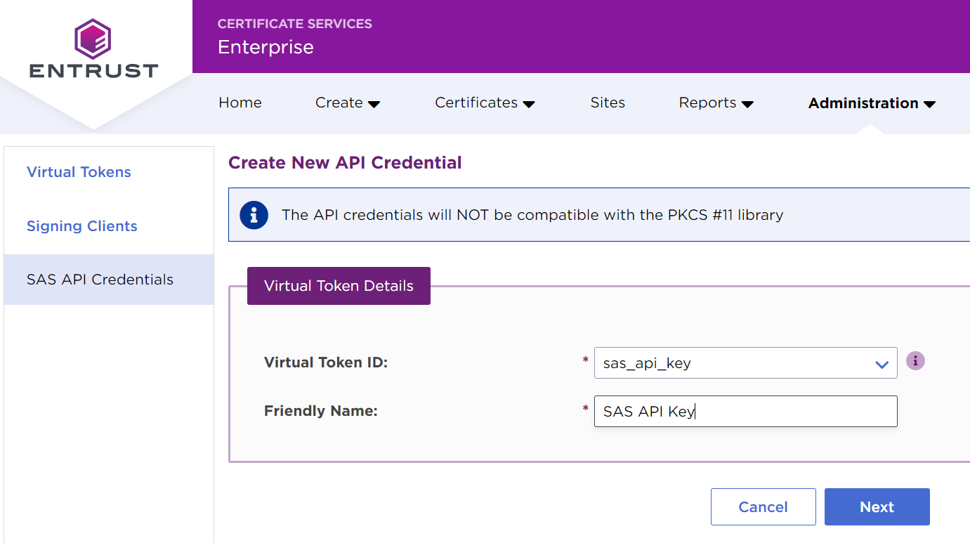 - In the Virtual Token ID field, enter a unique identifier for the new API credential.
