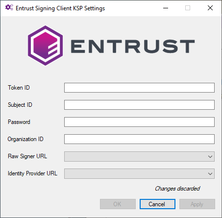 - In the Entrust Signing Clienbt KSP Settings dialog, enter the data obtained when Getting API credentials.